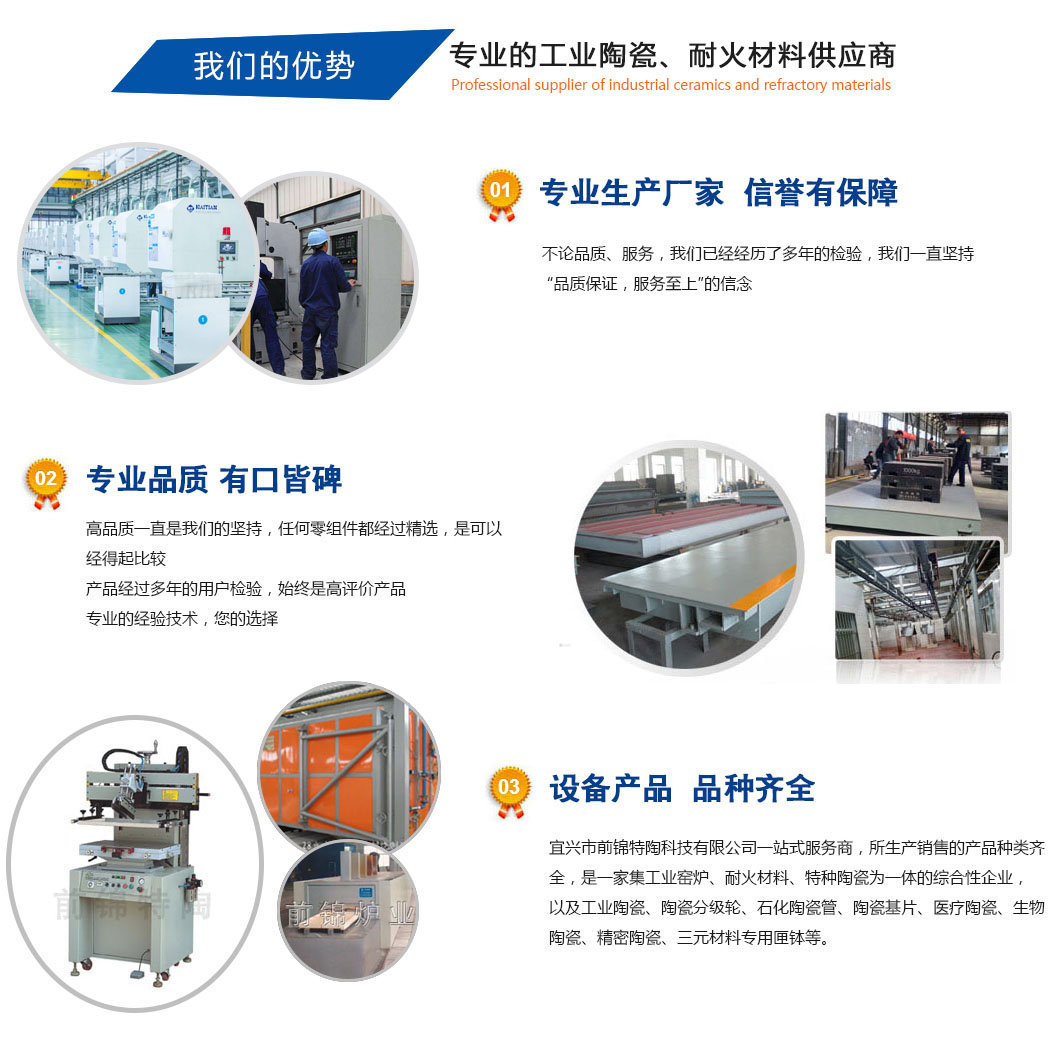 宜興市前錦特陶有限公司作為成員企業之一,公司主要生產工業陶瓷、窯具、匣缽、窯爐內襯系列。工業陶瓷以生產氧化鋯陶瓷、氧化鋁陶瓷、碳化硅陶瓷、氮化硅陶瓷等先進陶瓷為主;碳化硅制品有碳化硅異形件、三明治板、爐管等系列;耐火高溫窯具為剛玉爐管、剛玉莫來石制品、剛玉推板等產品;以及燒結墊板、氧化鋁空心球制品、sic板、石墨坩堝、堇青石復合莫來石板移進板、鋯粉、氮化硅陶瓷環、陶瓷棒、石化陶瓷管、陶瓷基片、磨介、分級輪和氮化硅球閥、熱電偶保護管、升液管等... ![]() |